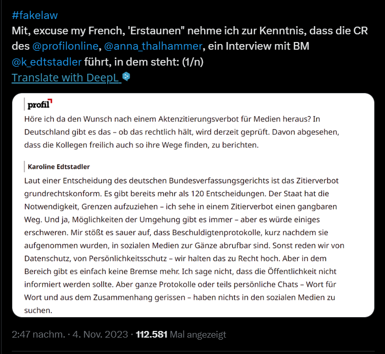 and an (upcoming) opinion text in profil later this week. The headline will be “Warum Edtstadlers Aktenzitierungsverbot Unsinn ist. Die ÖVP-Verfassungsministerin will Medien nach deutschem Vorbild beschränken, um Beschuldigtenrechte zu stärken. Sie sollte sich mit der dortigen Rechtslage intensiver beschäftigen.” - This will - finally - bring all remaining career possibilities in the federal chancellery to an early end. :-).