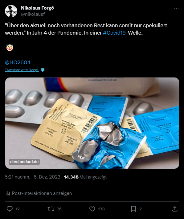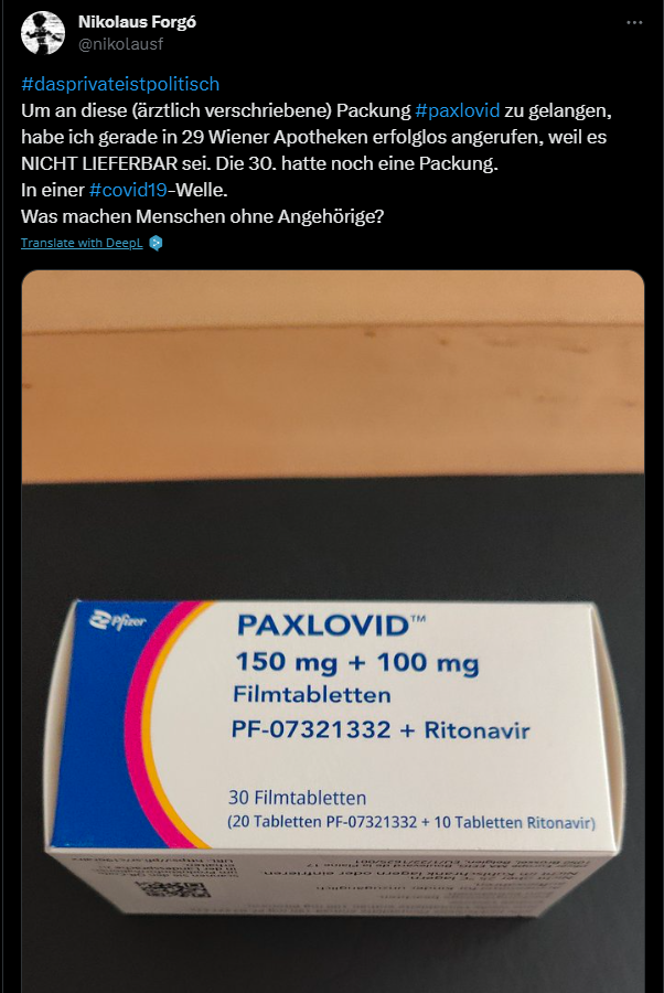 The strangest sentence in the many reports, excusess, explanations etc. of this unbelievable situation is this one from Der Standard stating that, once again, after 4 years of pandemic, we are still lacking of the most fundamental data needed to know what’s actually going on - in this case how many packages of Paxlovid are still available, a secret seemingly unknown to everybody in this country.