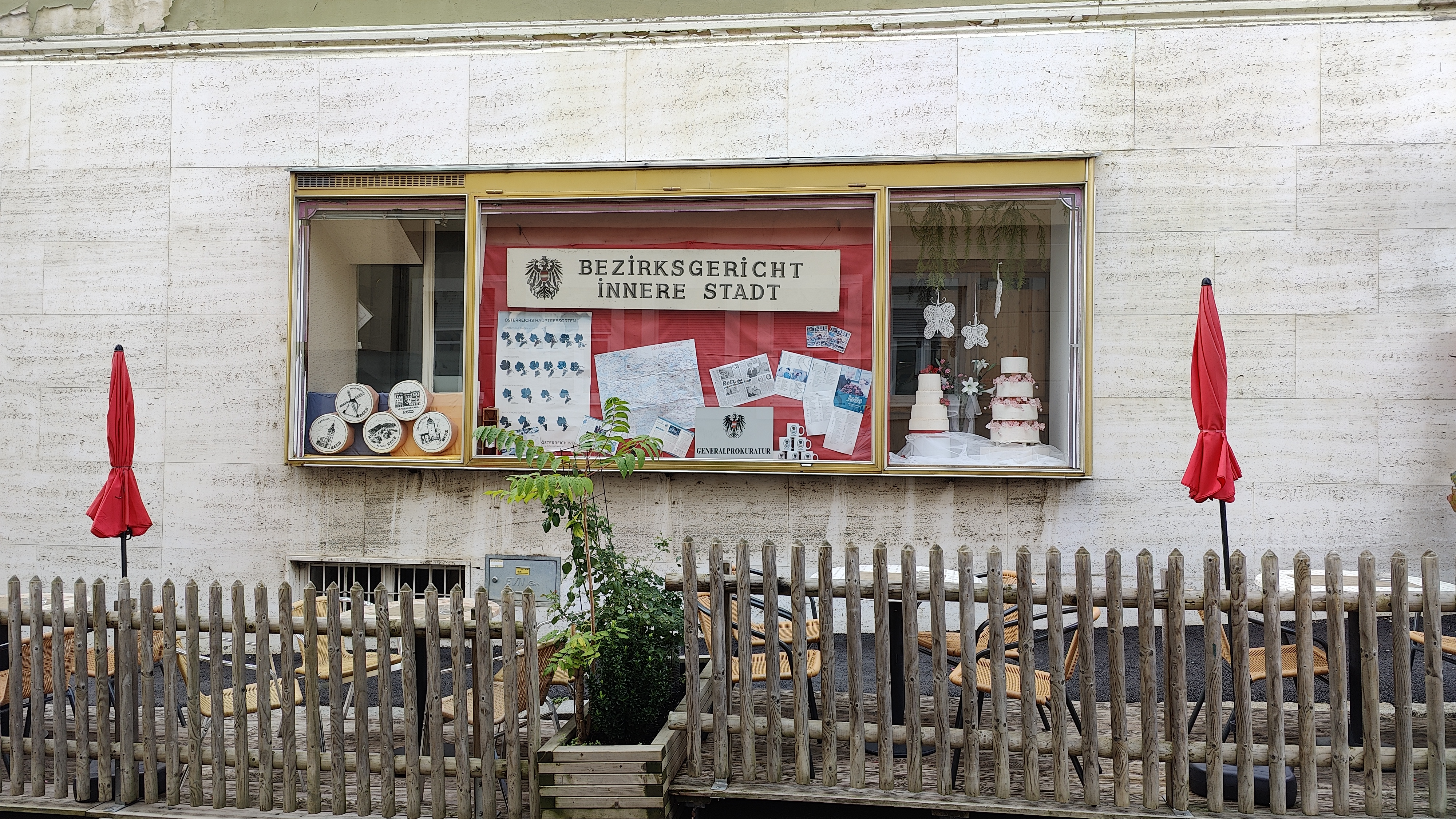 This is the Stadtcafe in Retz (which has a nice main square). I have no clue why they think that they are or should be part of the Viennese judicial system.