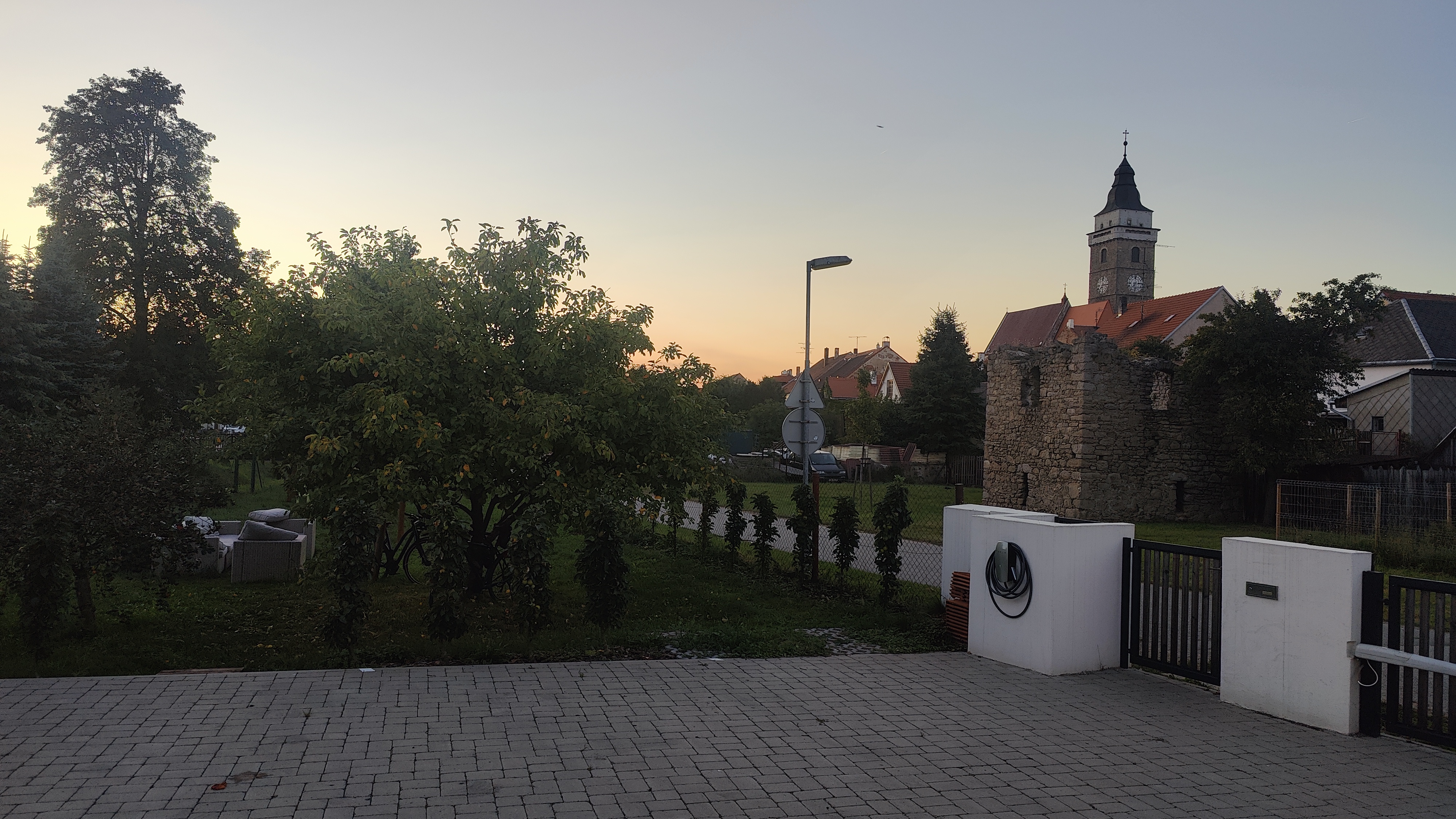 Although you ride through even more emptiness in The Cech Republik (no bicycle lane, but almost no traffic on the side streets; the main square of Slavonice looks beautiful but was covered in almost complete darkness - Wikipedia has a daylight picture; , we hardly met anybody anywhere), some people invested quite some money into the idea that people could become crazy enough in the near future to like such a kind of vacation and might like a decent appartment. The one we rented onlie (no problem to find one) can be occupied without needing to meet anybody, including the landlord, is paid online, has highspeed internet, a beautiful garden with a barbecue, a full kiitchen and a Tesla-connector (for 1.800 Czech crowns - less than 75 € per night.