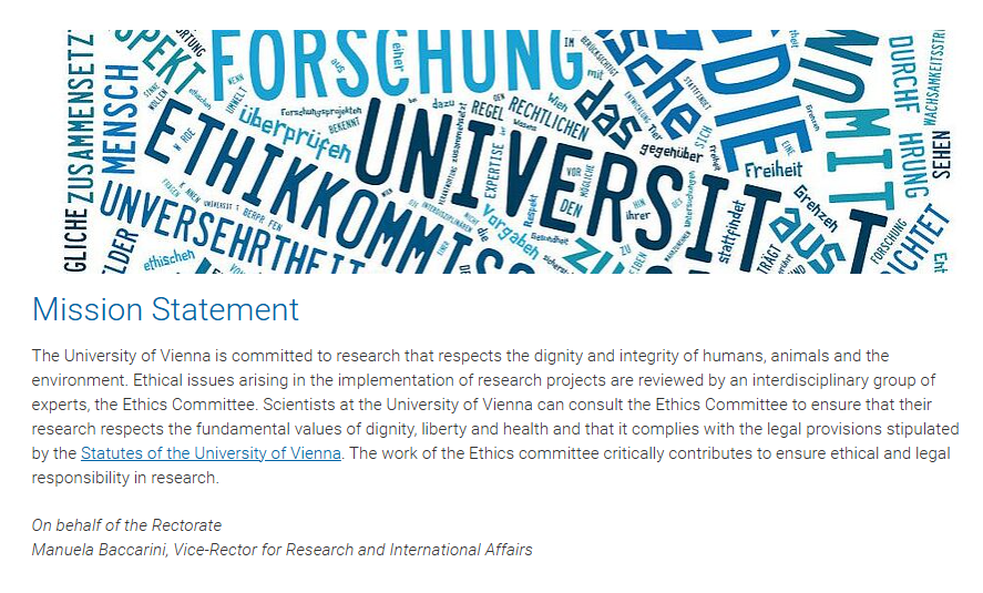 I attended (as alternate member) a meeting of UNIVIE's ethics committee. Following the statutes, the committee "prepares expert reports on [...] research projects" and "assesses whether the protection of the rights, safety and welfare of the subjects [...] or compliance with animal protection and welfare law [...] are adequately ensured when implementing the research project".
