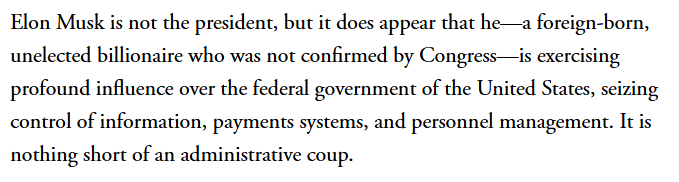 “To describe the current situation in the executive branch as merely a constitutional crisis is to understate the significance of what we’re experiencing. “Constitutional crisis” does not even begin to capture the radicalism of what is unfolding in the federal bureaucracy and of what Congress’s decision not to act may liquidate in terms of constitutional meaning.”