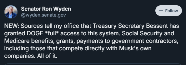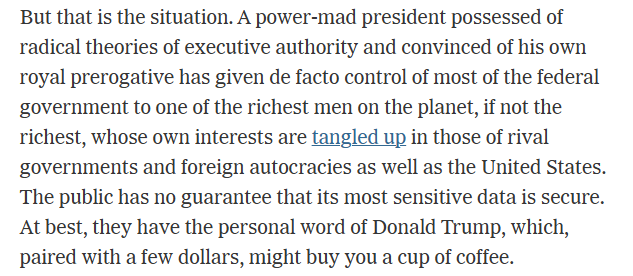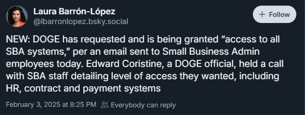 I am trying to understand what’s going on with Elon Musk’s Department of Governance Efficiency (DOGE). Everything heard about this is just crazy and haunting. The data protection rule in the President’s Executive Order is a joke: “Agency Heads shall take all necessary steps, in coordination with the USDS Administrator and to the maximum extent consistent with law, to ensure USDS has full and prompt access to all unclassified agency records, software systems, and IT systems. USDS shall adhere to rigorous data protection standards.”