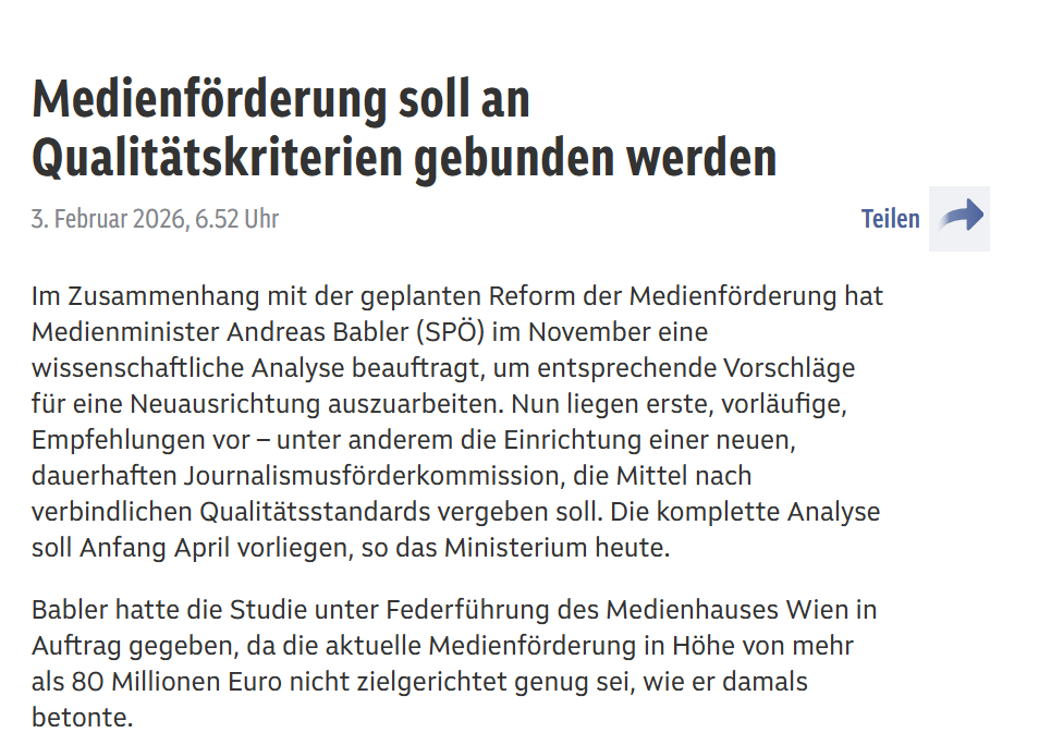 The Datum Trust advisory board (I am a proud member of) will have a meeting next week. I would expect that the ongoing debates on the reorganisation of media support in Austria will - somehow - be topical.