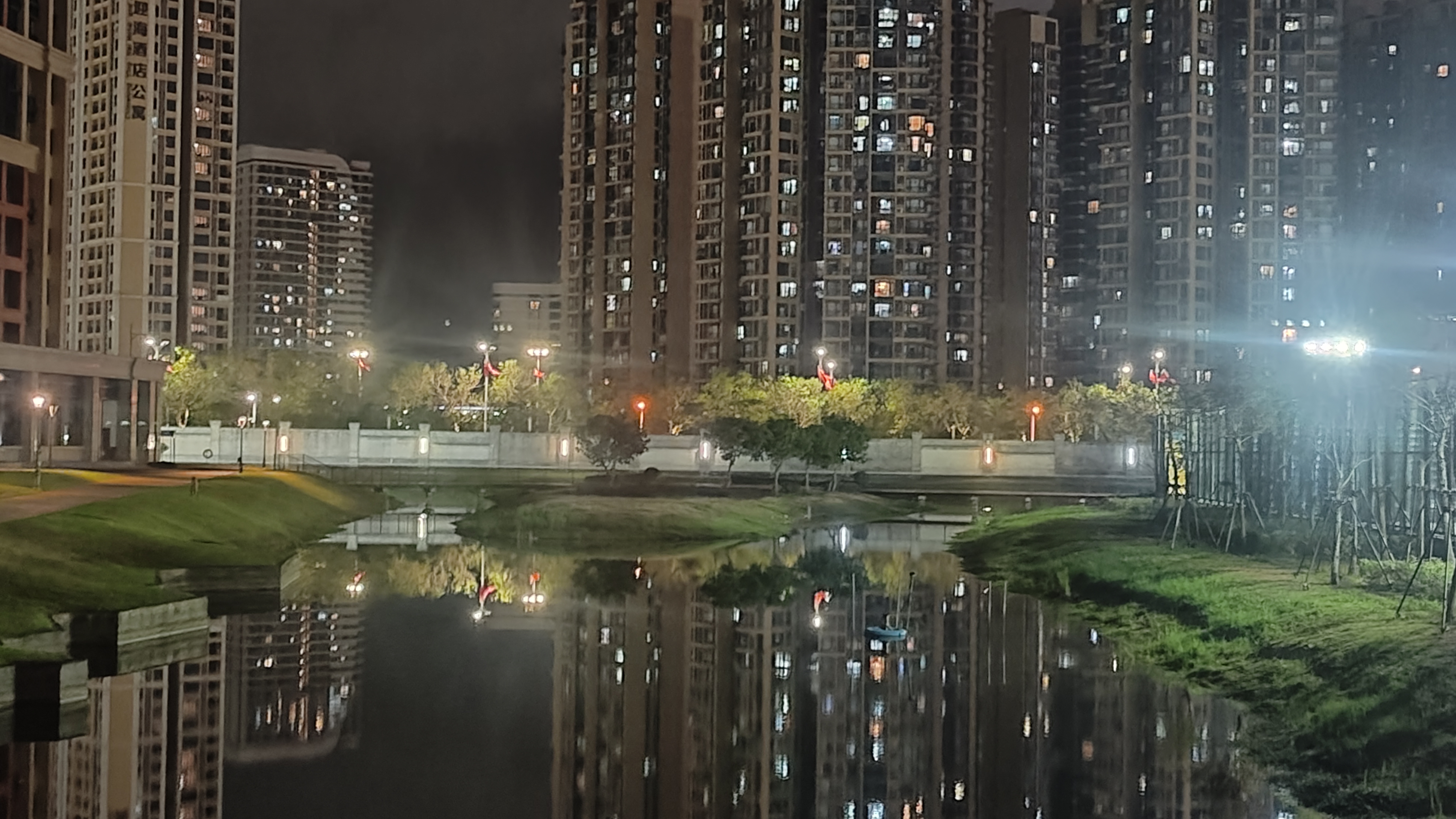 The wall, illuminated and with some Chinese flags and appartment buildings behind