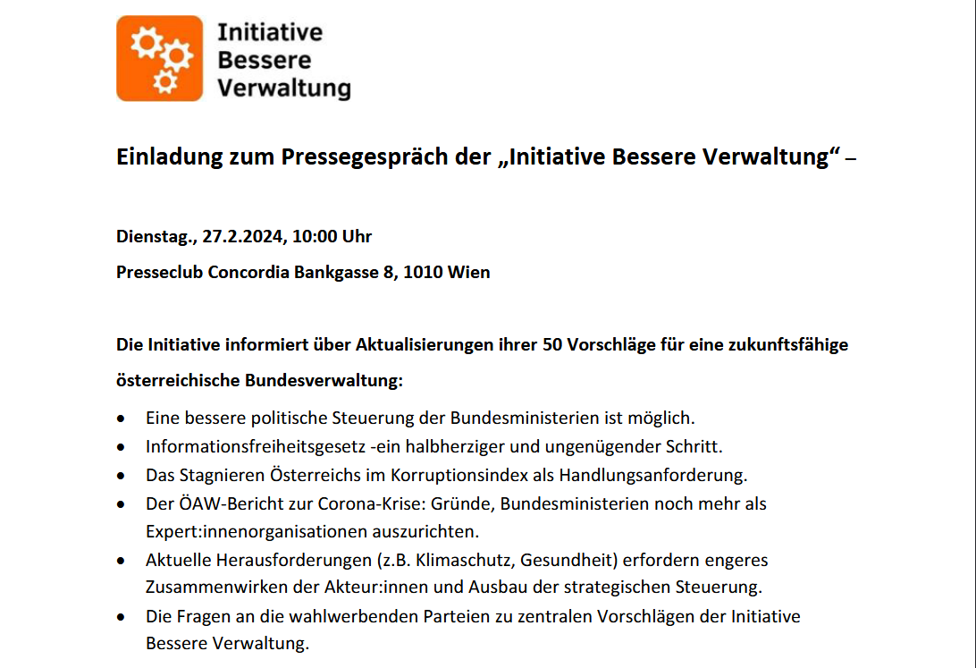 On Tuesday, February 27, the initiative for better administration is giving a pressconference at Presseclub Concordia. We will speak about recent developments, including corruption, rule of law, unbundling of politics and administration and freedom of information. I will cover the last mentioned aspect. We will also present six questions that we ask all parties represented in the Austrian Parliament prior to the elections in autum.