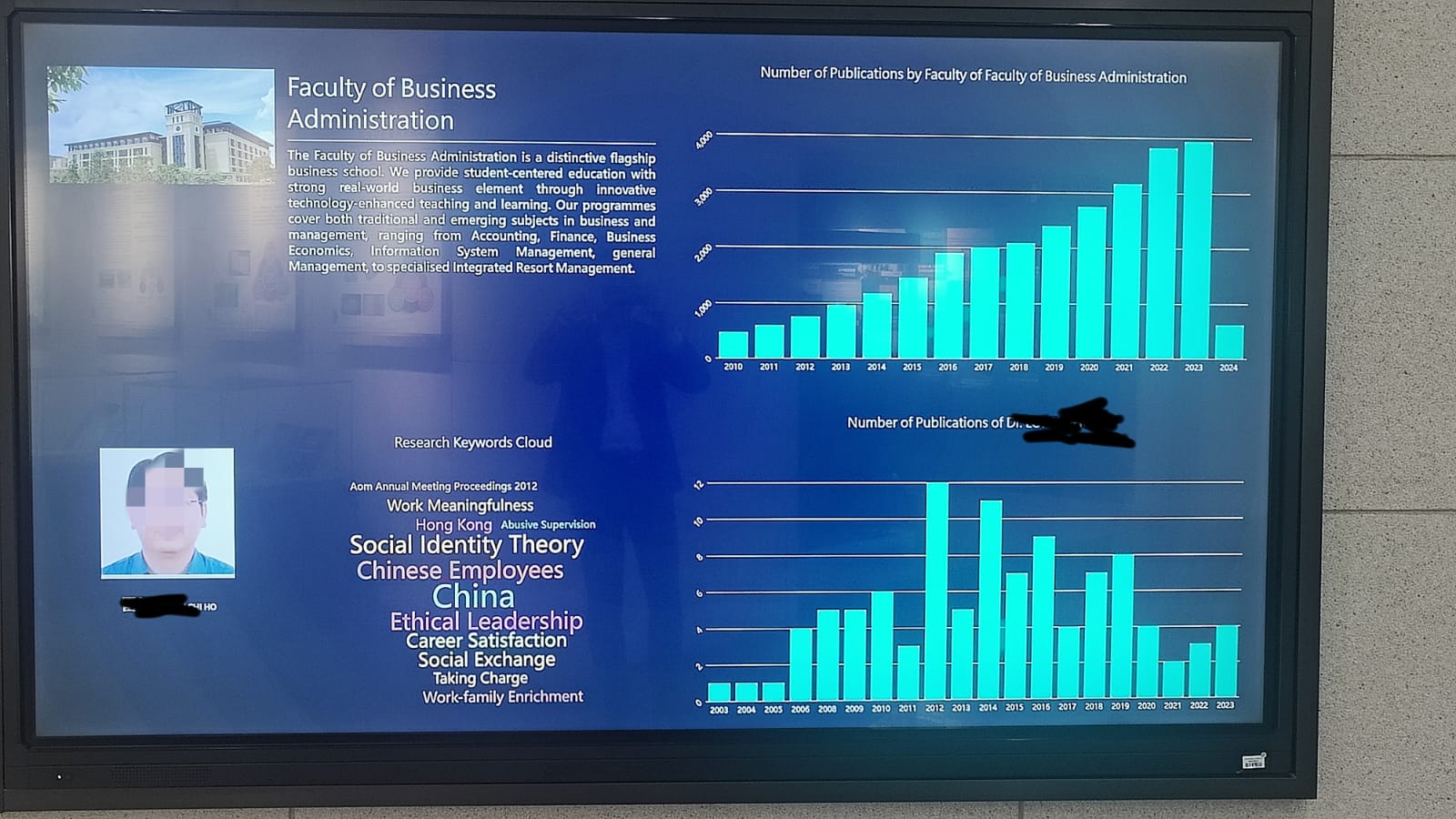 The aula has huge videowalls, one of them showing the research output - measured by publications per year - of individual researchers who are presented with full name and a portrait.