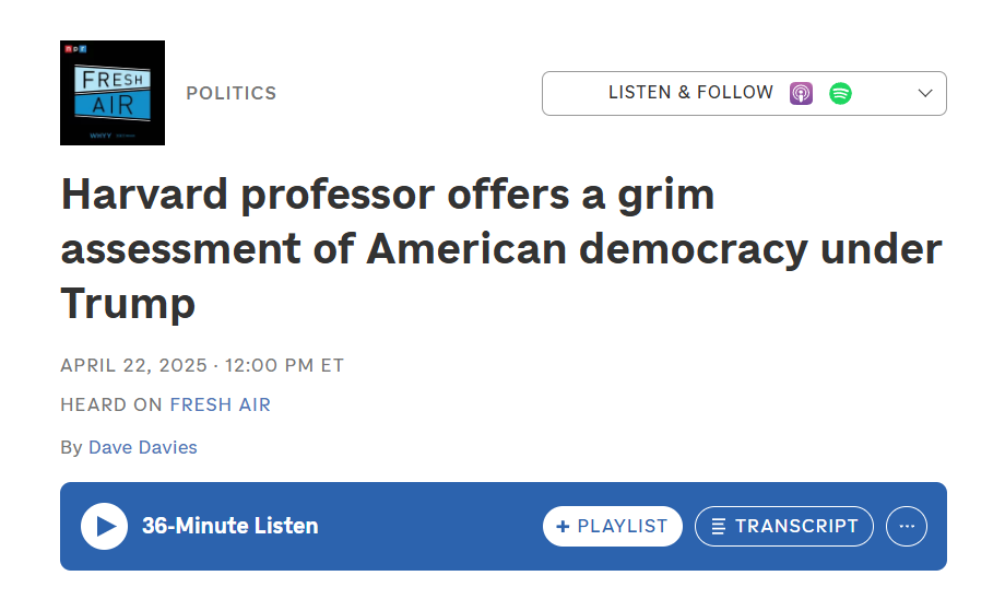 Levitsky argues in the interview profoundly that the USA are no longer to be seen as a liberal democracy. One of the many interesting details is that he consistently refers to Hungary as a model for where the US are at the moment. What’s happening in Harvard (unbelievable!) is also discussed in some detail. The interview is - stupidly - “not available in my region” via Spotify, but the website manages to deliver the content anyhow and its worth being heard.