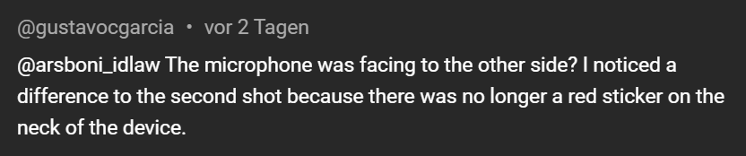 Correct. The Neumann TLM103 has a cardoid polar pattern and I was stupid enough not to see that it had twisted around and that I used it from the wrong side (180 degrees turned). The red sticker is the Neumann-logo - probably there to avoid this mistake.