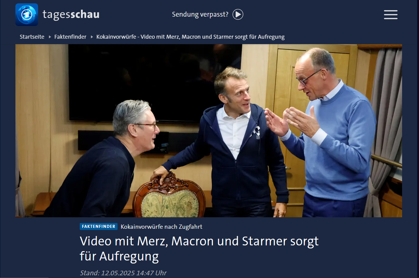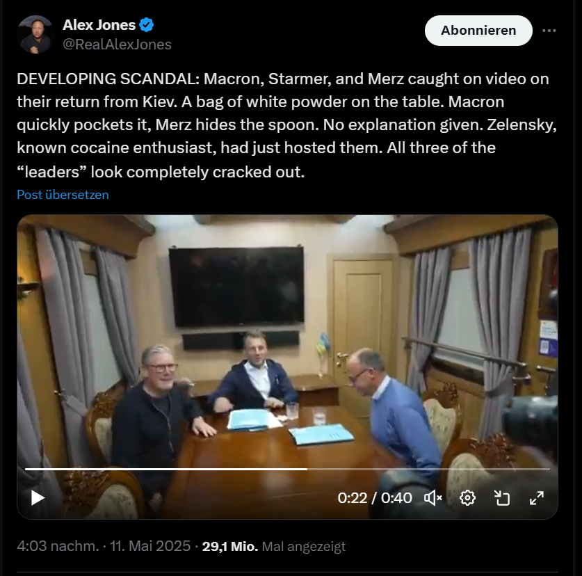 and a Tweet by Alex Jones spreading the absurdity that Macron, Starmer and Merz were consuming cocaine together