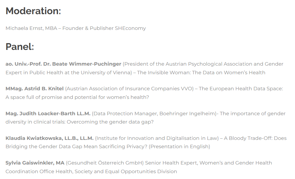 I was very proud that Klaudia from the department was among the speakers and I learned a lot: for example, that Malta is the European country in which women have the highest expactation of healthy years of life, that endometriosis is a disease still unknown to one third of the population, that there was hardly any data on menstruation in Austria available before the report on menstruation health 2024 and on the consequences that the average health data subject is a healthy, wealthy white man.