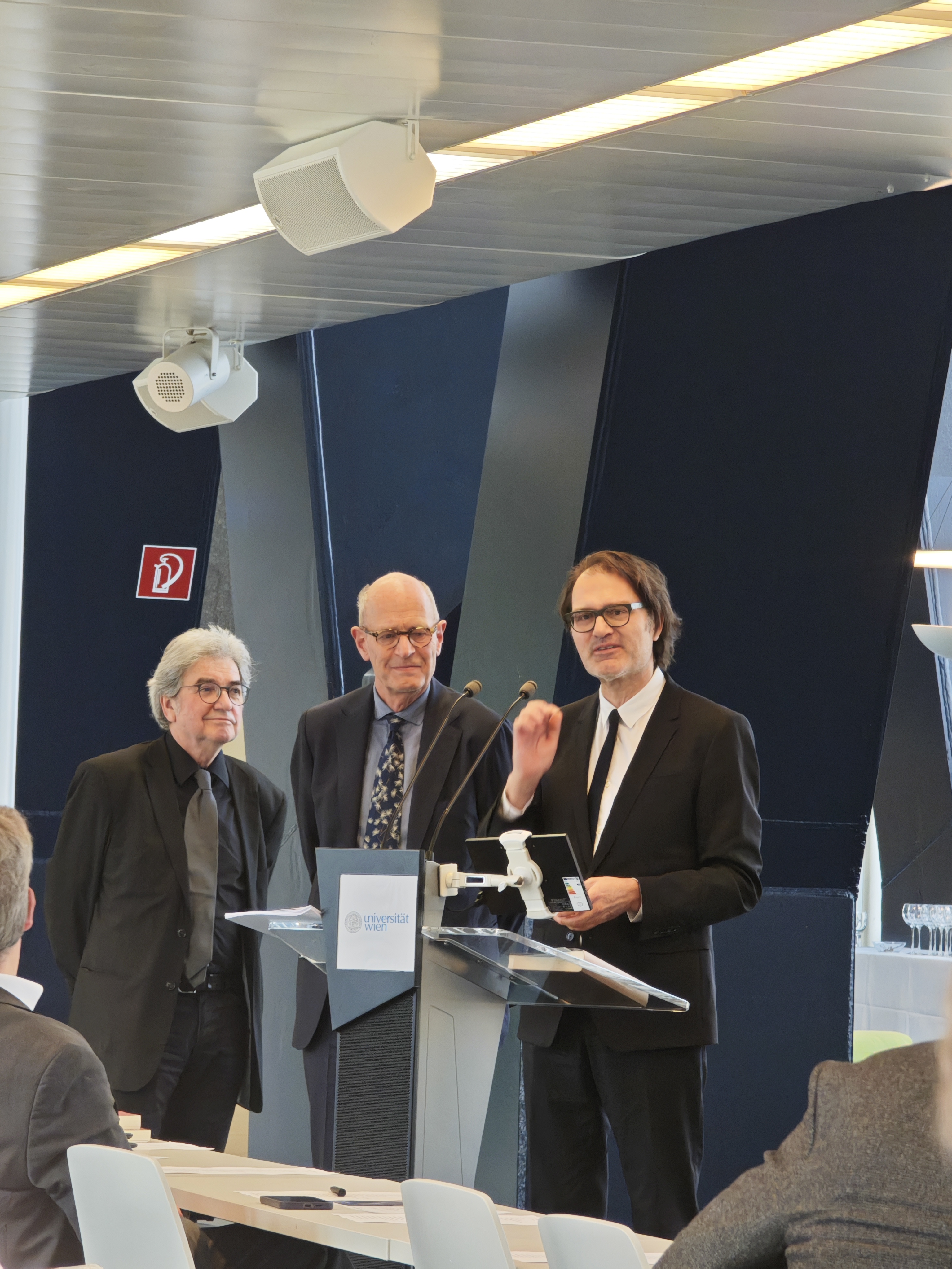 I attended the memorial for Günther Winkler on Monday evening and learned, a lot, about the Juridicum in a lively session jointly given by (from right to left) Miloš Vec, Michael Hiesmayr (the architect Ernst Hiesmayr’s son) and (Hiesmayr’s then assistant) Reinhardt Gallister.
