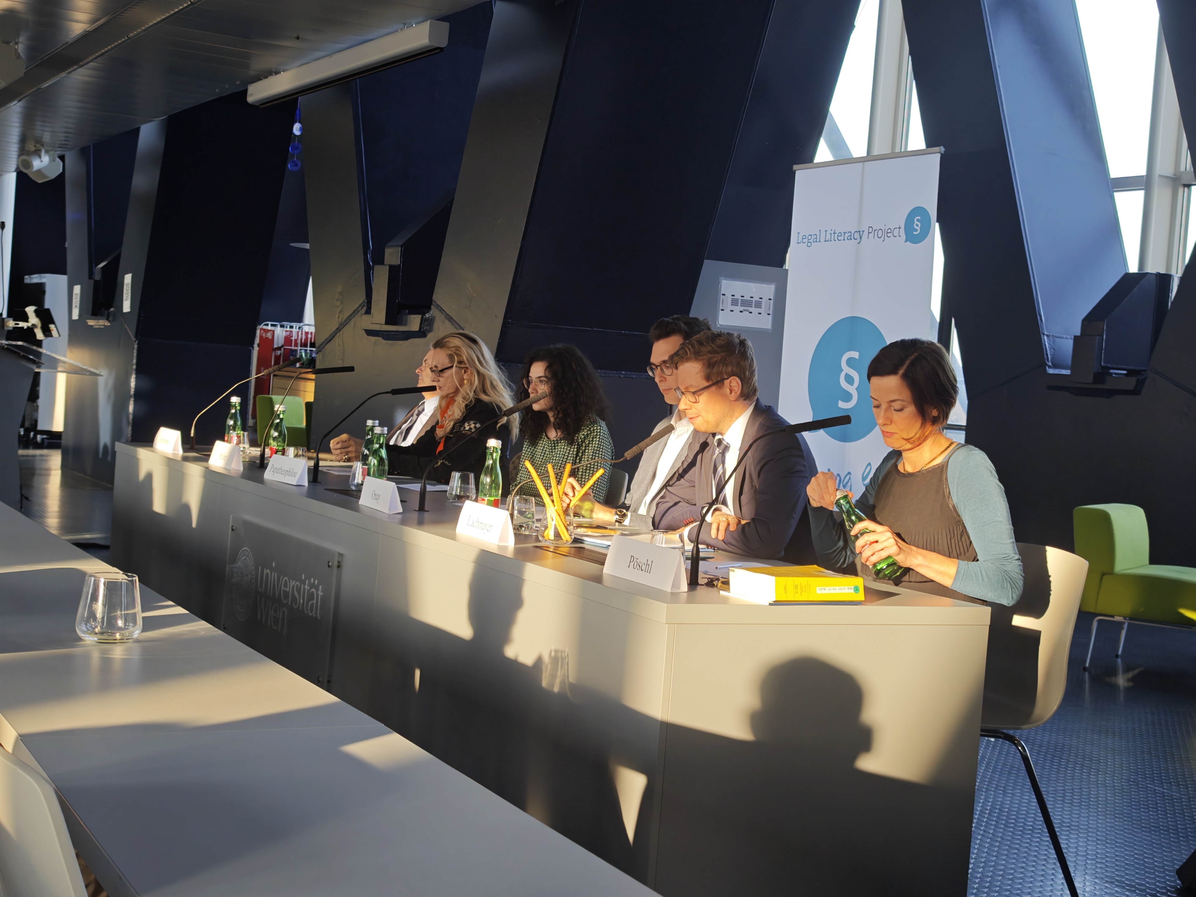 The panel with (from right to left) Univ.-Prof. Dr.in Magdalena Pöschl, Prof. Dr. Konrad Lachmayer, Ege Onay, LL.M. (WU) (moderation), Mag.a Simela Papatheophilou, Mag.a Dr.in Brigitte Heller, MBA, MinR Mag. Oliver Henhapel discussed vividly how the young can be better adressed to participate in legal/political debates. Some of the facts and figures presented were particulary alarming (25 % of students in vocational schools are active voters, for example) and not too much consensus was found on what could and needs to be changed - but, as a minimum, everyone appreciated the role and importance of the LLP.