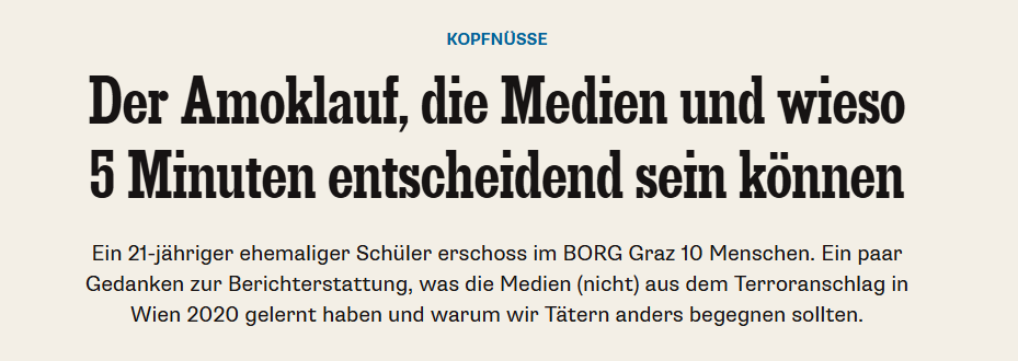 It took me a little more time from there then to learn that since the Columbine attack a whole subculture with rules and codes on “how to do a school shootings” has emerged and how likely it is that the attacker in Graz is one in a long row of people being inspired by Eric Harris and Dylan Klebold - the Columbine attackers and other school shooters. I would recommend to read