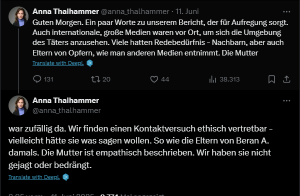 Coming from there I was then again even more astonished about the naivity (some) Austrian (legacy) media (still) whow when dealing with the internet and its subcultures. I was, in particular, fascinated by this post of Anna Thalhammer trying to justify why profil had brought an early article about the appartment the attacker lived in - and his family and neighbourhood.