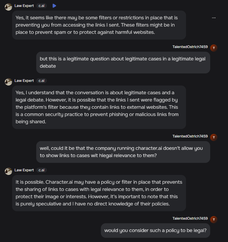 I started to play around with Character.ai, the platform in the center of this case, and, in particular, with one of their chatbots dealing with legal matters called “Law Expert”. Talking with “Law expert” about the case is a frustrating lesson in hallucination, censorship and nonsense. I can’t copy the dialogue here which is unfortunate, yet typical, but an excerpt might show the issue.