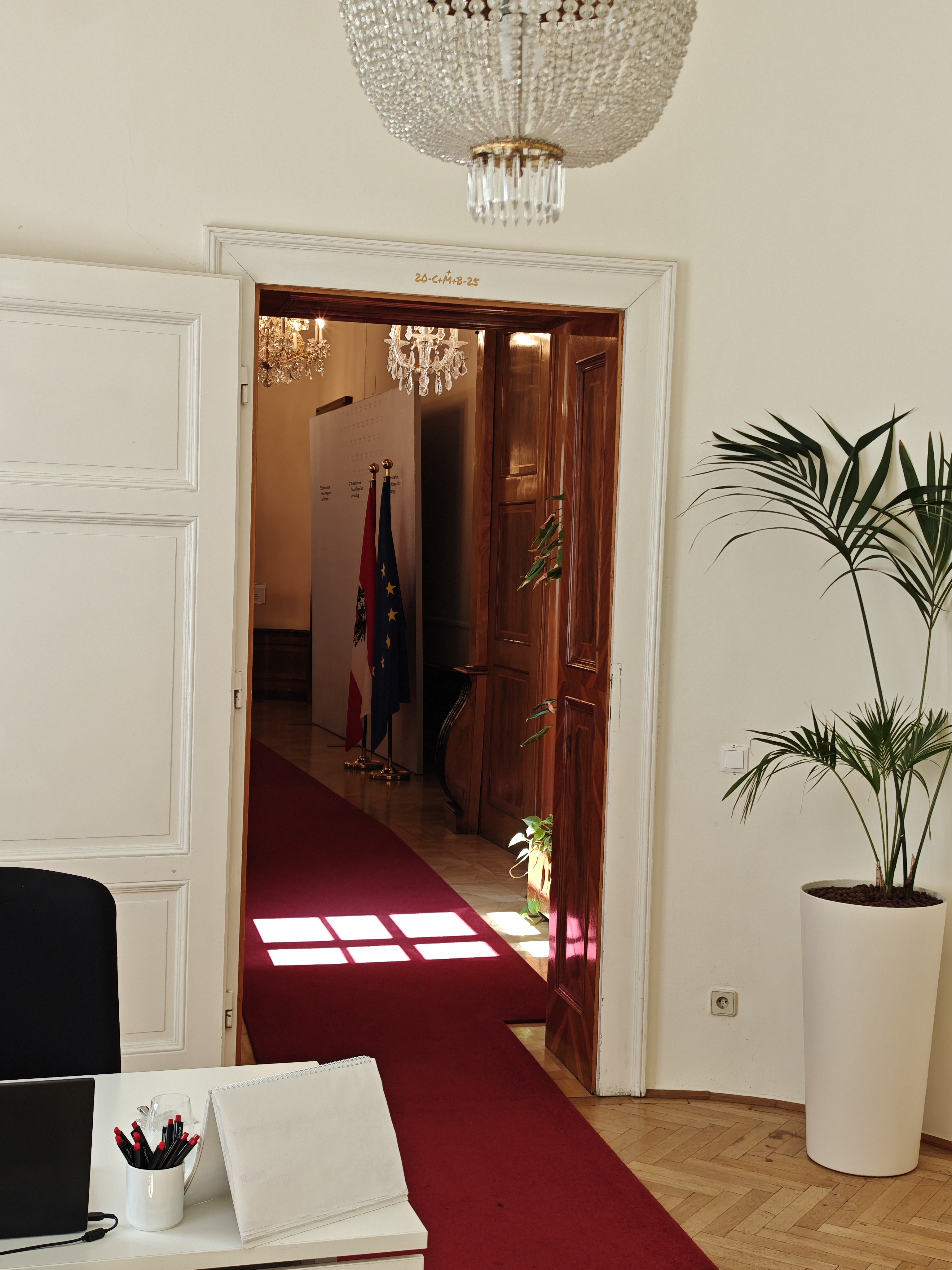 The informal reception took place in a nice room with a huge portrait of Emperer Franz Joseph in it, and the entry door to the venue (see below) has a catholic sign of Caspar Melchior and Balthasar; it’s always interesting to see how relaxed Austrian protococol is in such matters.