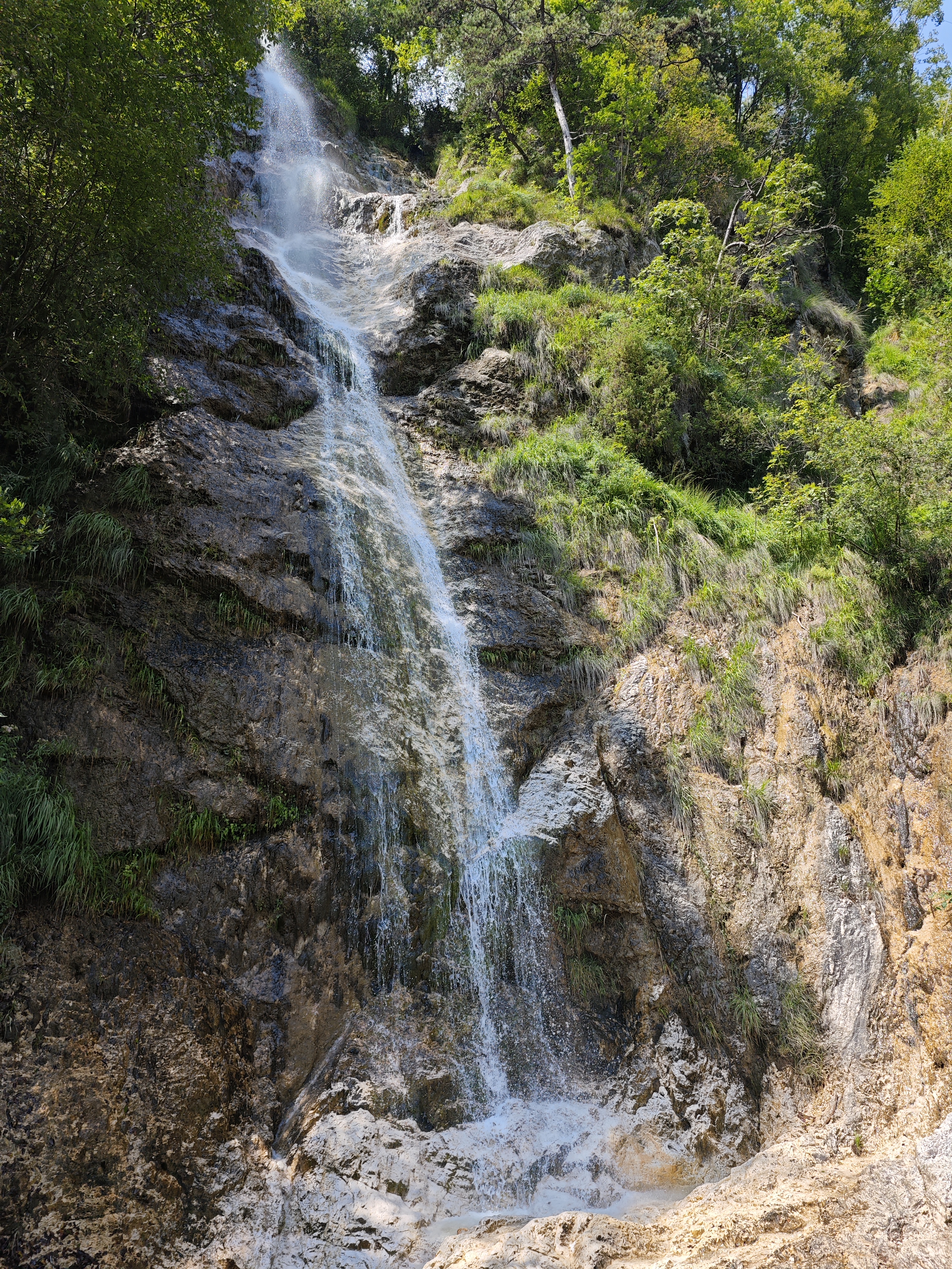 After a capuccino at the border (with some military border guards, but no border controls), we went on the “Alpe Adria Radweg” to Tarcento, over all more than 100 km- which was a lot on day 1 in extreme heat. The cycle path is very nice, with lots of old tunnels that are cool and dark and beautiful views on the river Fella. There was even a beautiful waterfall directly on our way and Felix took a cooling bath there.