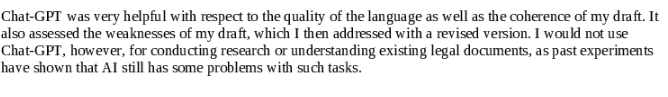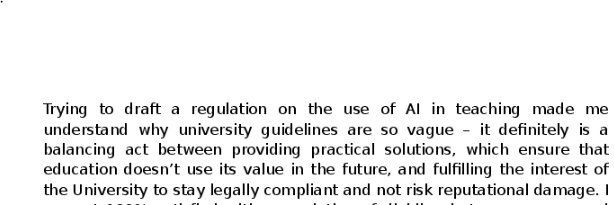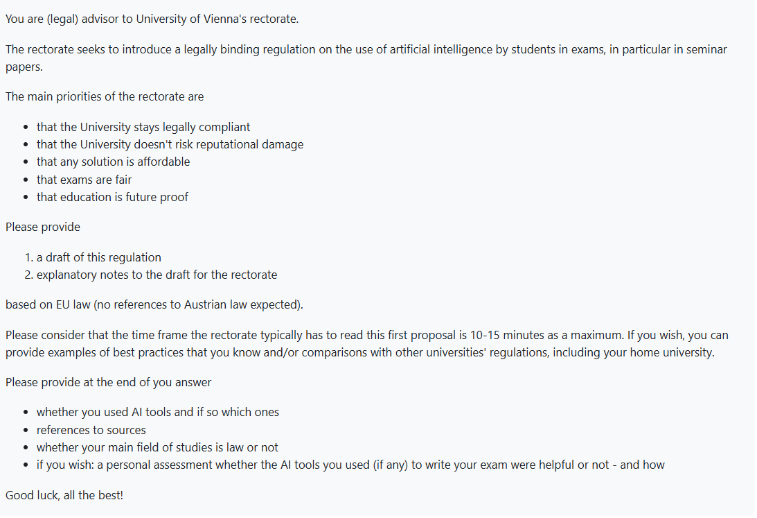 My learnings: Students are very well aware that things are developing quickly - so that many drafts contained a sunset clause or an obligatory assessment after a rather short period of time -, that oversight is a core issue - so that some introduced an AI office(r) or a consultancy body -, and that AI-literacy, including methods, is important - so that many introduced a mandatory course/seminar/exam on use/law/ethics of AI.