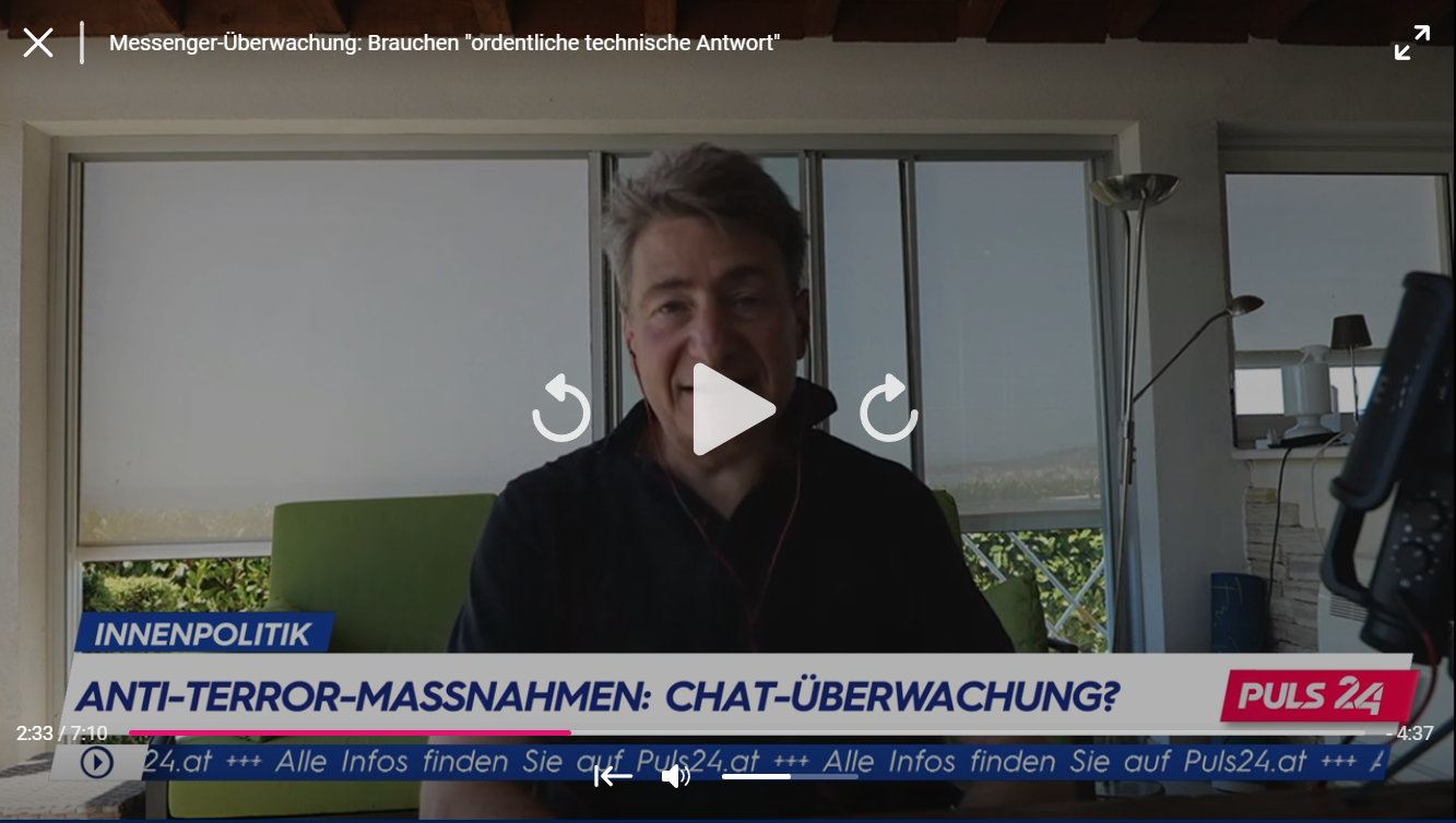 Austria is yet in another debate on whether and how internet messaging services such as Whatsapp, Signal or Telegram could be surveilled by state authorities. I have a strong opinion that this is a bad and dangerous idea and gave a TV-interview on Wednesday on this.