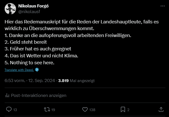The moment I am writing this (Thursday morning), the weather is - again - (too) warm and sunny. Everything, including the debate on the aftermaths of the catastrophy, are back to the Austrian normal - exactly as predicted a week ago.