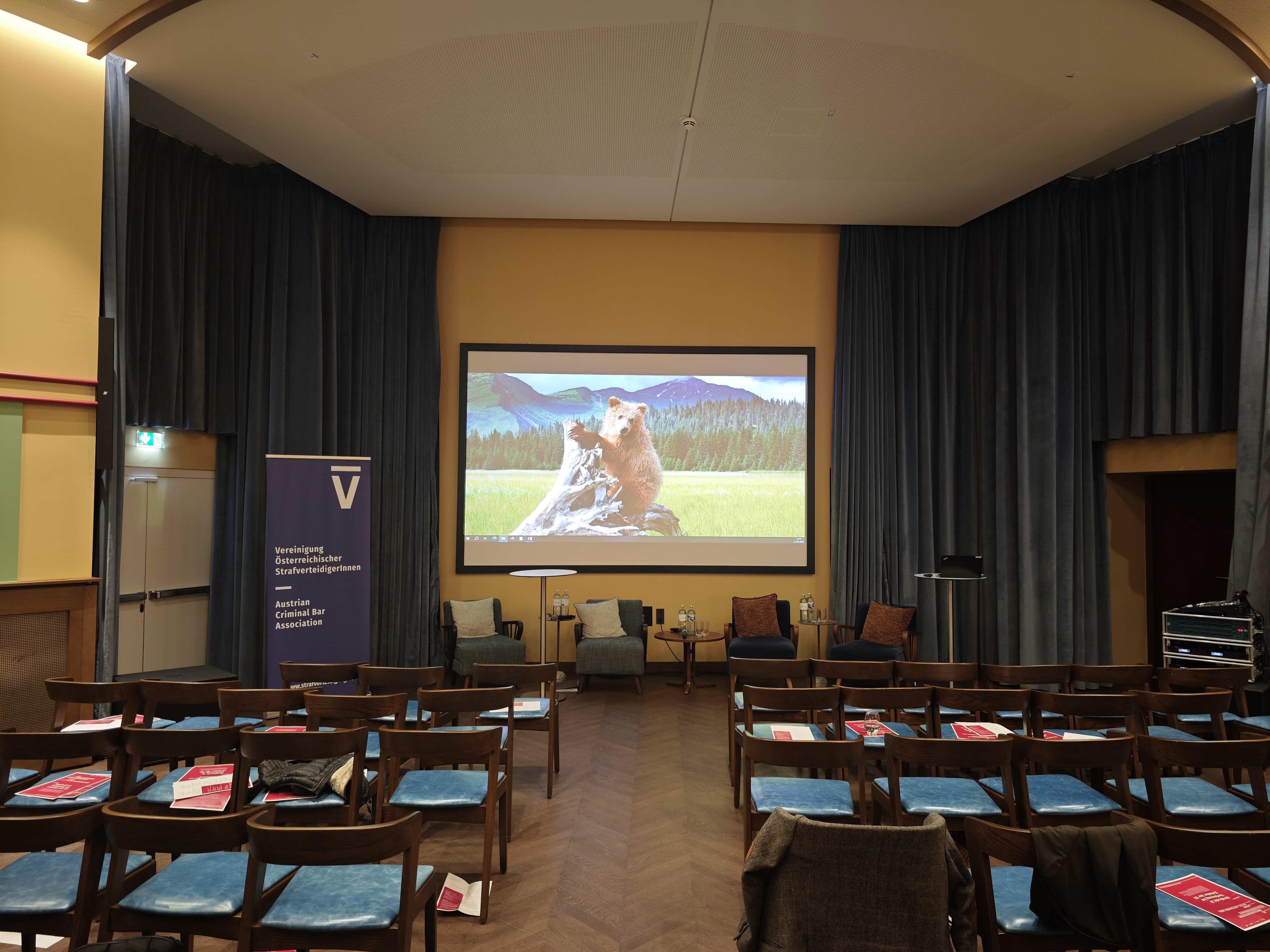 The venue was the former headquarter of the Vienna Chamber of Commerce that has been turned into a hotel now. It’s a nicely renovated 50-ies building. I am not really into criminal defence lawyering but everyone I know from the field was here, the room was packed with (prominent) people.