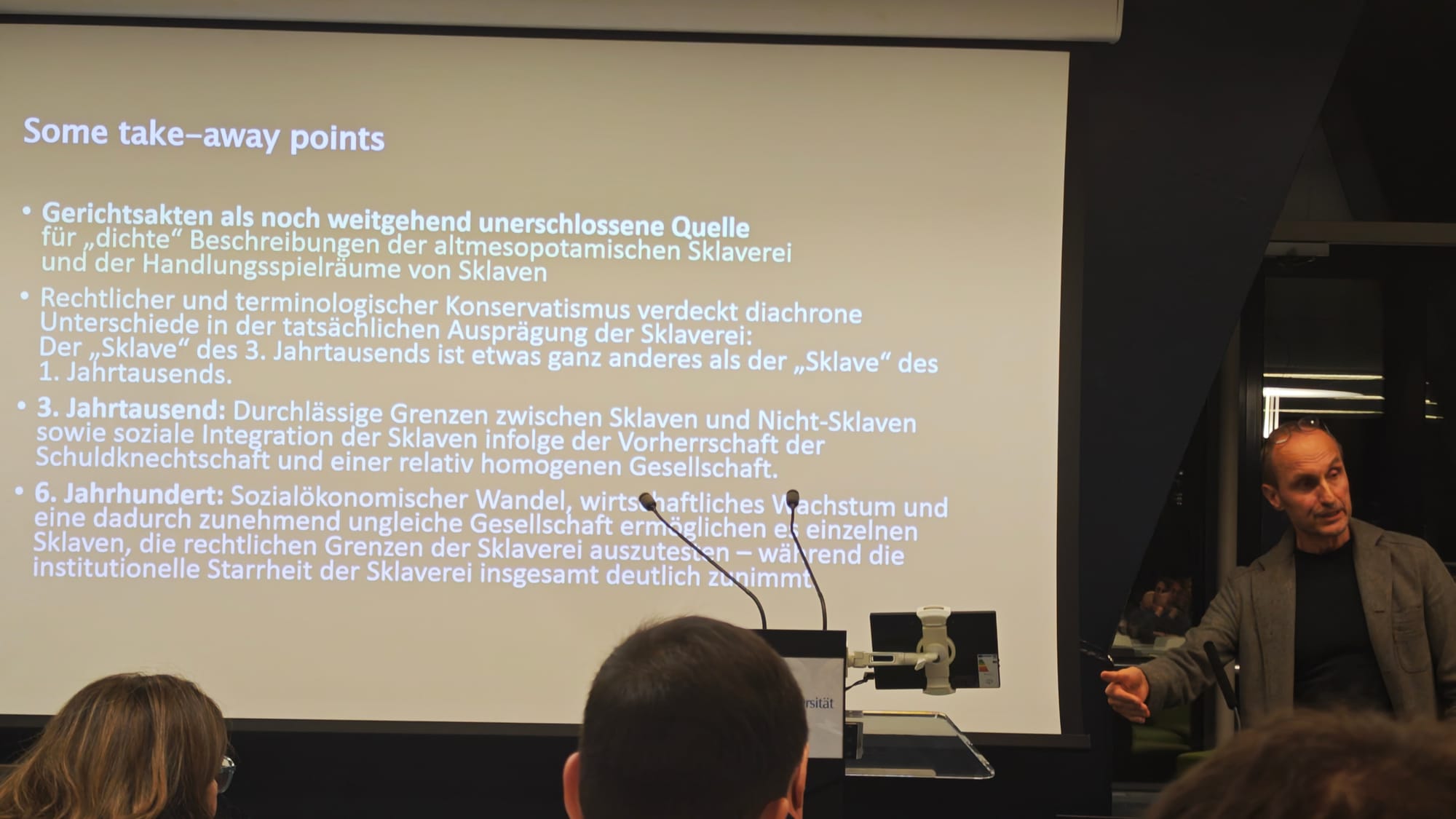 I was, in particular, fascinated by the richness of color in which he lead us through the hstoric changes in slavery by interpreting (the remainings of) ancient court files and in the different methodological approaches to analyse them today.