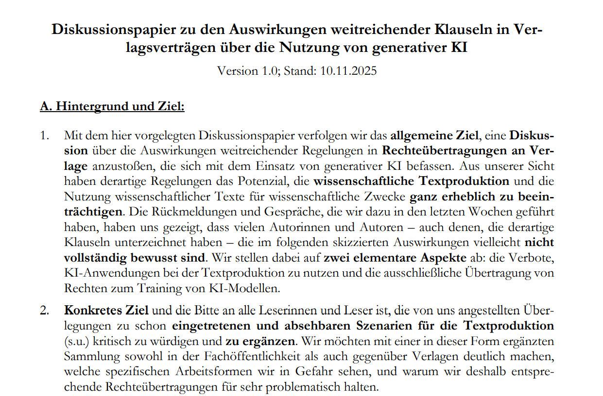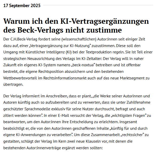 Trigger for this are attempts of Beck-Verlag to get its authors to sign additional clauses in their contracts. Grünberger wrote a substantive text against this idea in September.